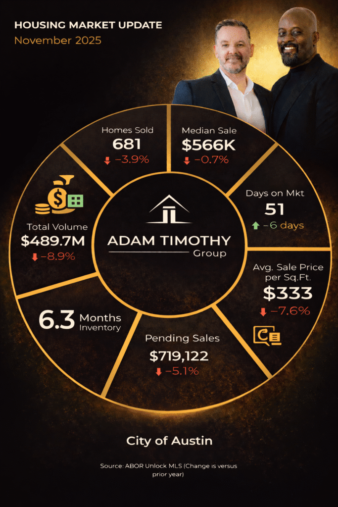 Austin Market Update • November Austin Housing Inventory Is Up: What November Means for Buyers and Sellers Inventory is changing how decisions get made in Austin real estate. Buyers have more choices. Sellers need sharper pricing and stronger positioning. Here’s the November snapshot—and what it means in practice. Active Listings 11,926 Up 11% year-over-year Months […]