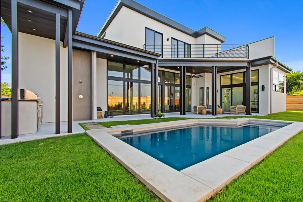 The backyard is an entertainer’s dream, featuring a stunning pool by Innovative Pools, lush Bermuda grass, and a beautifully landscaped oasis with agave, lavender, and cherry laurel trees. The outdoor kitchen, equipped with a gas grill, fridge, and exterior shower, turns this urban retreat into a resort-like experience.